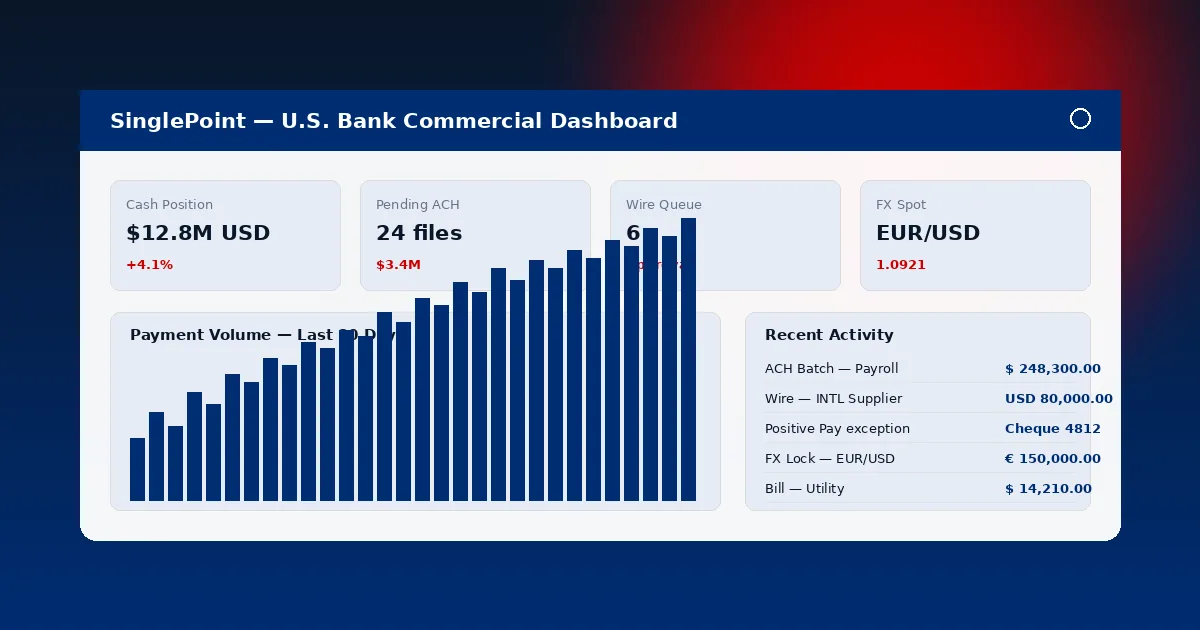 SinglePoint Custom Reports include native connectors for SAP S/4HANA (via BAI2 and IDoc), Oracle NetSuite (via SuiteTalk), Microsoft Dynamics 365 Finance (via OData), Sage Intacct (via CSV import schema), QuickBooks Online (via native banking feed) and Workday Financials (via Workday Bank Connect). Each connector is tested against the ERP's current-release parser.